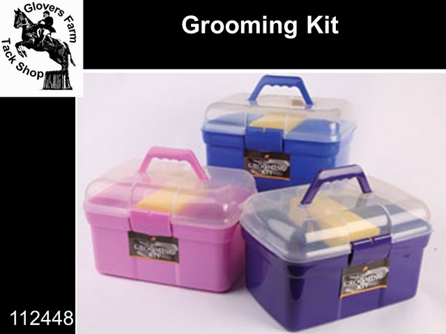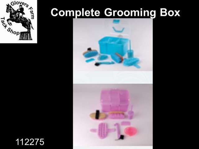 Complete Grooming Kit In Carry Box, Includes; Dandy brush, Body brush, Plastic curry comb, Rubber curry comb, Hoof Pick Brush, Mane Comb and Hoof Oil Brush With Lid.