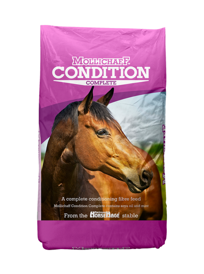 Mollichaff Condition Complete is a conditioning mix for horses, containing a balanced blend of alfalfa, dried grass, oat straw, fibre pellets, barley, soya flakes, soya oil and mint. It also includes Yea-sacc®, a prebiotic, vitamins, minerals and trace elements.