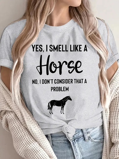 Funny Horse Lover T-Shirt - Light Grey Casual Top with "Yes I Smell Like a Horse" Saying, Machine Washable Everyday Tee for Women, Horse Shirt, Summer Wardrobe, Playful Design, Comfortable Fit