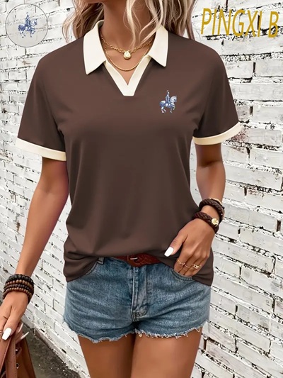 Women's Light Purple T-Shirt with Contrast Collar & Short Sleeves - Breathable Relaxed Fit Casual & Semi-Formal Top, Subtle Horse & Rider Print, Machine Washable All-Season Shirt for Casual Attire,, Office - Versatile Women's Fashion