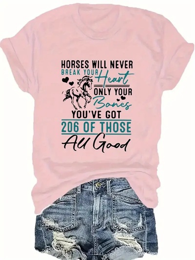 Women'S Casual Crew Neck T-Shirt with Inspirational Horse Quote, "Horses Will Never Break Your Heart Only Your Bones" - Soft Polyester Fabric, Short Sleeve, All-Season Comfort, Ladies T Shirt