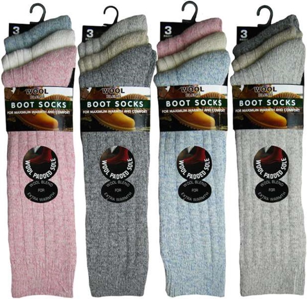 These ladies super soft chunky wool non elasticated cushioned sole socks feature a wool blend for extra softness, toughness and hard wearing for cold weather protection, can be worn for lots of outdoor activities. The advantages of non elasticated socks are to reduce restriction of circulation to your feet and stop unsightly marks on your legs, idea for people who are travelling on long journeys, with diabetes and also some certain medical conditions.